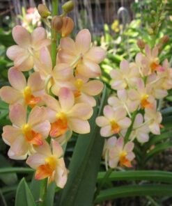 This is a rare hybrid between two species that is phalaenopsis and vanda. This is a cross of Phalaenopsis pulcherrima and Vanda Pralor. This is a compact plant can product upto 20 flowers in one spike with sweet fragrance. It blooms with beautiful red lip and orange petals two to three times a year.
