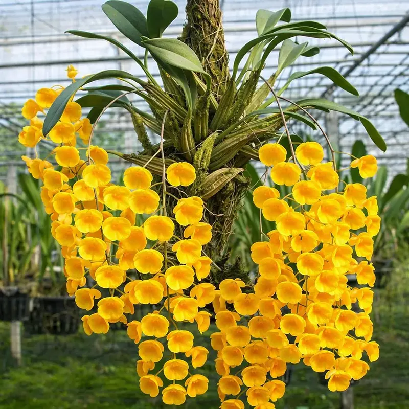The Dendrobium Aggregatum Orchid is a stunning species orchid admired for its vibrant golden-yellow blooms and cascading flower clusters. Each flower features a rich yellow color with a deeper golden center, creating a warm and luminous display.