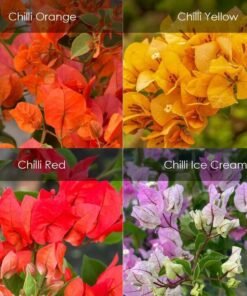 This is a pack of 4 different and beautiful colours in bougainvillea chilli varities. Size of the plants shows in the picture below. Chilli varities are easy to flower and long lasting. Colours are in red, yellow, orange and white.