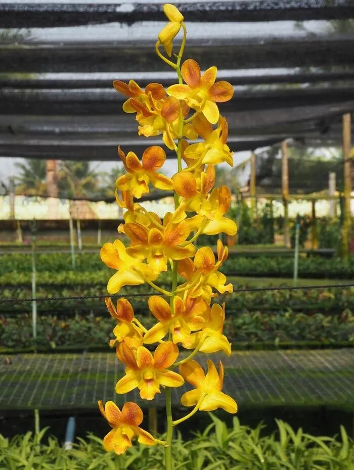 Each flowering spike produces numerous blossoms arranged along a tall vertical stem, forming a dramatic and elegant display. The bright yellow base color combined with brown highlights makes this orchid visually distinctive among yellow orchid varieties.