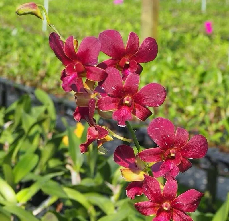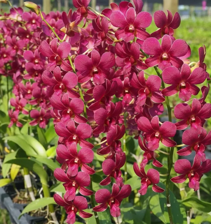 Butachong Brown #94 is a striking orchid seedling prized for its deep wine-red to chocolate-brown tones with subtle golden highlights near the center. The blooms form along elegant upright spikes, giving the plant a bold, dramatic presence that stands out strongly against green foliage. This selection is especially attractive for collectors who appreciate darker, richer color palettes.