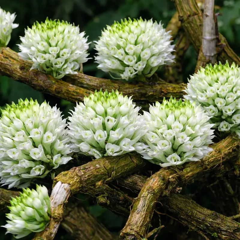 The Dendrobium capituliflorum – Brush Orchid is a fascinating orchid species admired for its distinctive flower clusters that resemble small brushes or pom-poms. Instead of traditional orchid blooms, this species produces dense spherical clusters of tiny white flowers with light green tips.