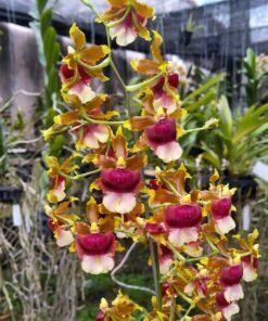 This oncidium is a hybrid of of Oncidium Pupukea Sunset and Oncidium fuscatum. This multi-colored Oncidium has a golden crown with beautiful pink body and a white skirt resembling a dancing queen. Flowers are fragrant and multiple clusters of flowers form on a spike.