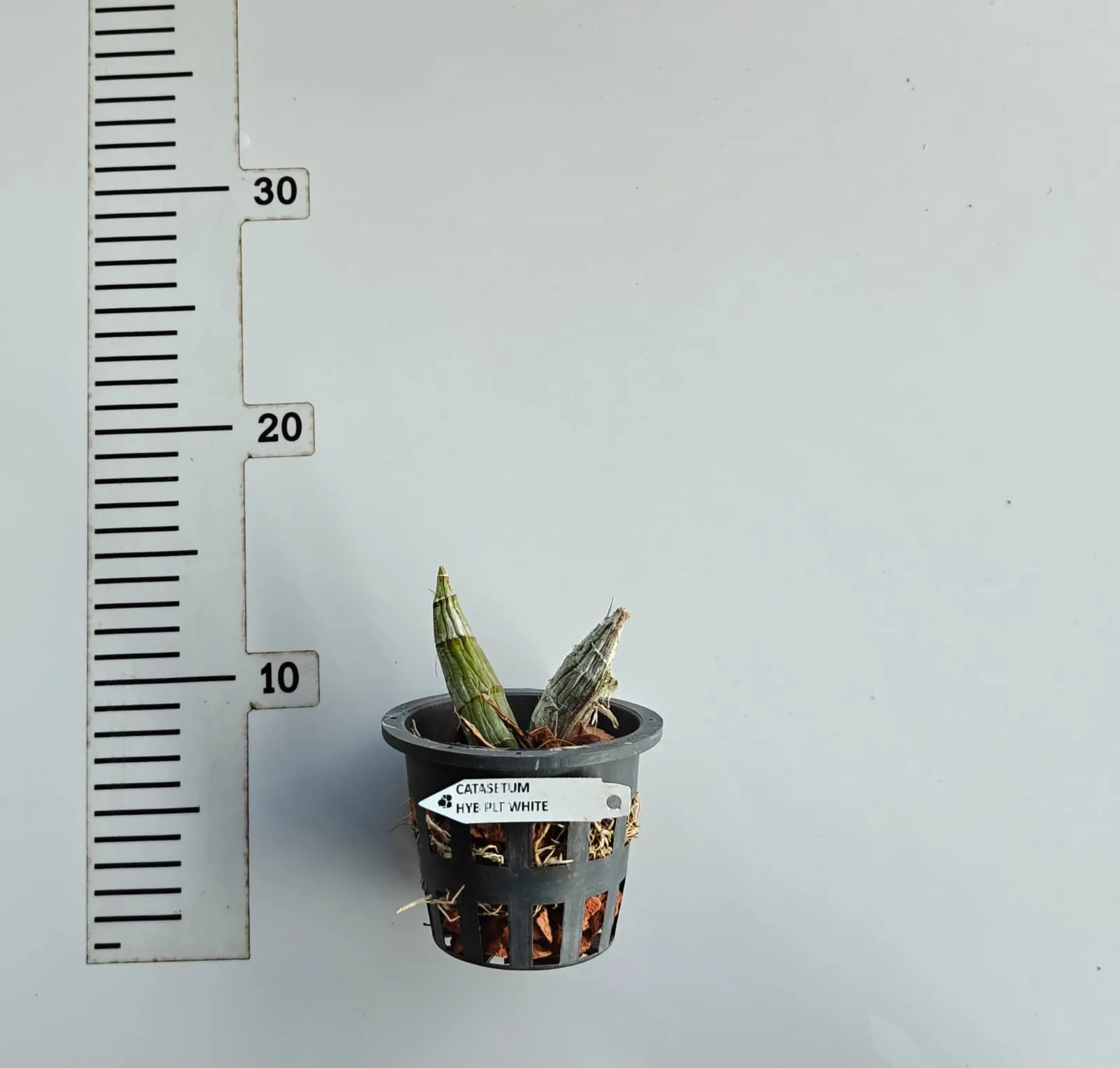 This is 3.5 inch pot size catasetum orchid plant. It will be delivered to you without flowers. Please check below the image and approximate size of the actual plant that will be delivered to you. It will be more or less the size shown below.