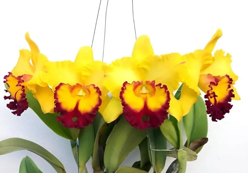 The Cattleya Golden Tang HIR Orchid is a vibrant hybrid admired for its striking golden-yellow blooms and bold contrasting red lip. The flowers are large, full, and beautifully shaped, showcasing the classic elegance of Cattleya orchids.