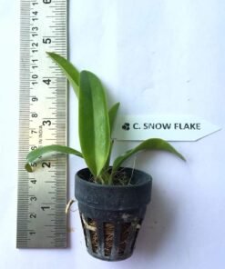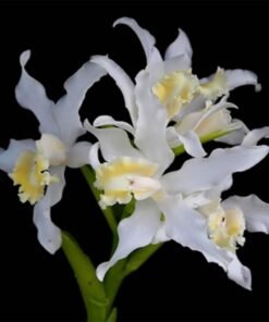 This hybrid cattleya has unusual flowers. The flowers are very bright white and has yellow center. Petals are curly and lips have beautiful curtain like folds. The flowers are fragrant in nature.