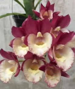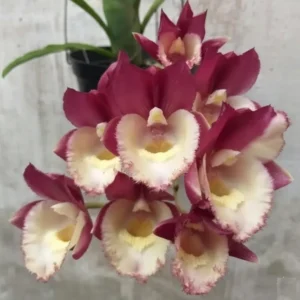 Clowesetum ‘Pierre Couret’ is a standout Catasetinae hybrid that blends the flower count and floriferous habit of Clowesia with the bold colour, form and presence of Catasetum. The result is exactly what your photo shows: clusters of full, bicolor flowers – deep raspberry/magenta outer segments and a wide, creamy-white lip with a delicate frilled edge. It’s the kind of flower that looks “finished” straight out of the sheath.