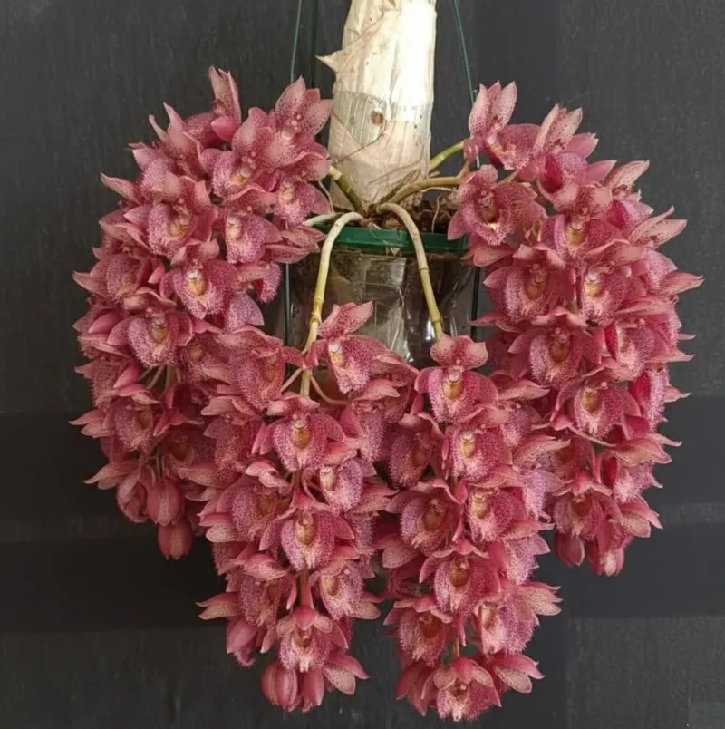 A dream Catasetinae cross for anyone who loves pendant, flower-packed spikes. This hybrid combines the soft, elegant, many-flowered style of Clowesia rósea with the boldness and flower substance of Catasetum Ivanae, giving you long, showy chains of pink, speckled blooms that look like a floral waterfall.