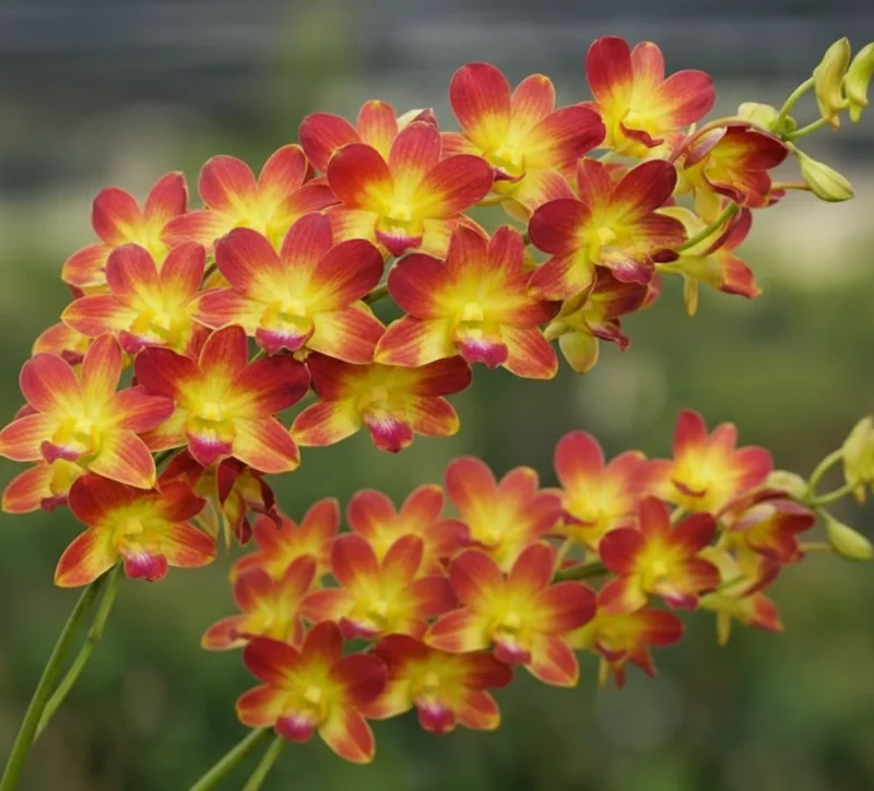 Each flowering spike produces multiple blossoms arranged along a graceful arching stem, forming a spectacular floral display. The vivid contrast between copper red and golden yellow gives this orchid a bold tropical appearance.