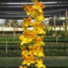 Each flowering spike produces numerous blossoms arranged along a graceful arching stem, forming an elegant cascading display. The harmonious blend of yellow and coral hues gives this orchid a lively and exotic appearance.