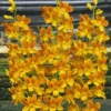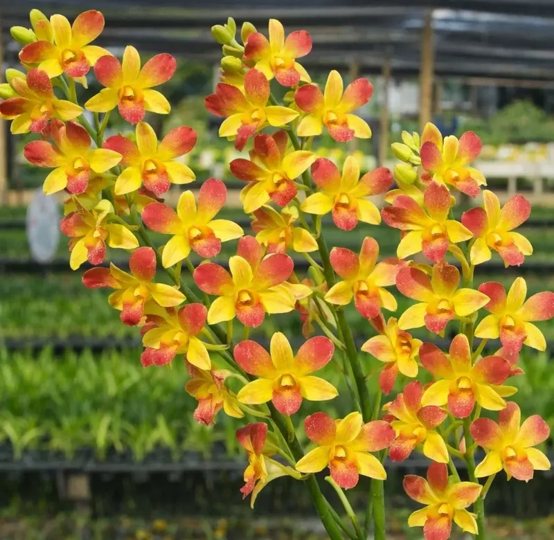 Each flowering spike produces numerous blossoms arranged along a graceful arching stem, forming an elegant cascading display. The harmonious blend of yellow and coral hues gives this orchid a lively and exotic appearance.