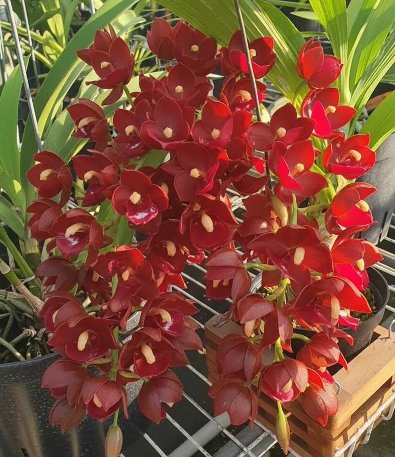 Cycnodes Taiwan Red is a stunning hybrid orchid admired for its deep red, glossy blooms displayed along dramatic cascading spikes. The flowers have a waxy texture and rich coloration that give the plant a bold, luxurious appearance when in bloom.