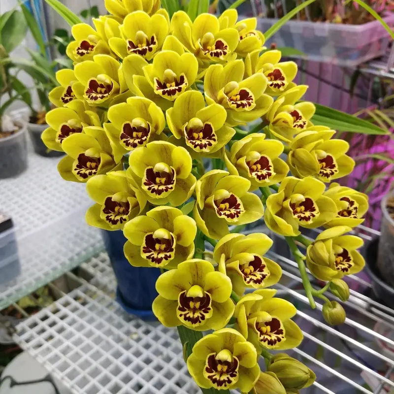 Cymbidium Sunshine Falls is popular among orchid enthusiasts for its abundant blooms, cascading flower spikes, and attractive color combination.