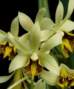 Flowers: The blooms are small yet striking, often creamy white to pale yellow with a velvety texture. The lip is the most eye-catching feature, usually bearing a bright orange or golden-yellow throat, sometimes with subtle veining or hair-like textures.