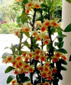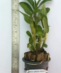 Formosum dendrobiums has very lasting flowers upto 2 months. A very unique dendrobium and a frequent bloomer. It is know for its sequential arrangement of flowers on its canes rather than on the spikes. Just like all other orchids they prefer indirect sunlight light. They also do well in bright and dim light conditions. This hybrid has greenish petals with bright orange lips.
