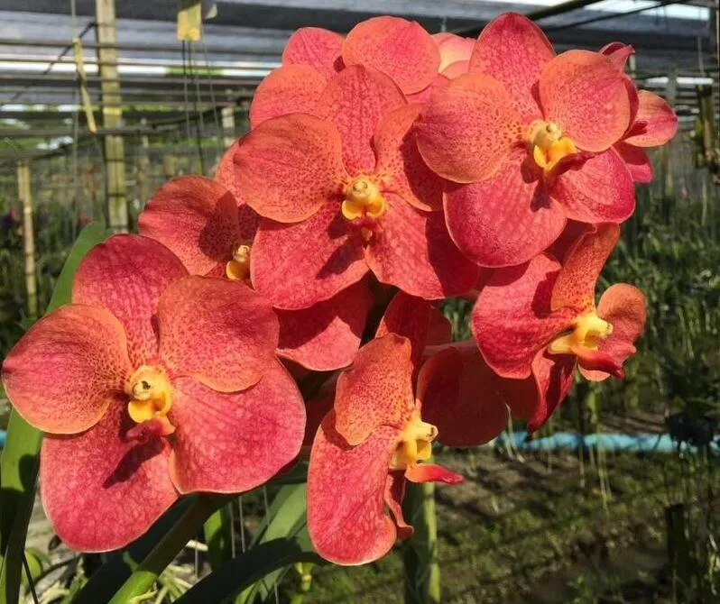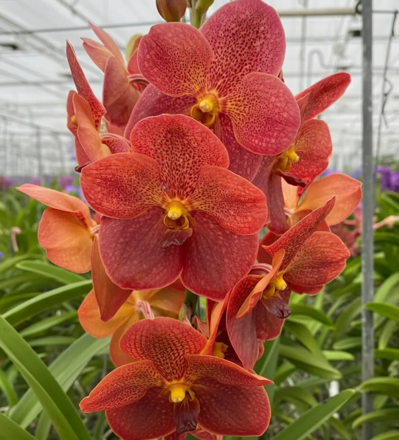 Vanda Fuch Sunset × Dr. Anek is a premium hybrid admired for its intense coloration and excellent flower form. The blooms display a deep coral-red to sunset-orange tone with subtle speckling, complemented by a bright yellow lip that adds striking contrast. Flowers are large, rounded, and long-lasting, arranged on sturdy spikes that showcase the plant’s vigor and quality.