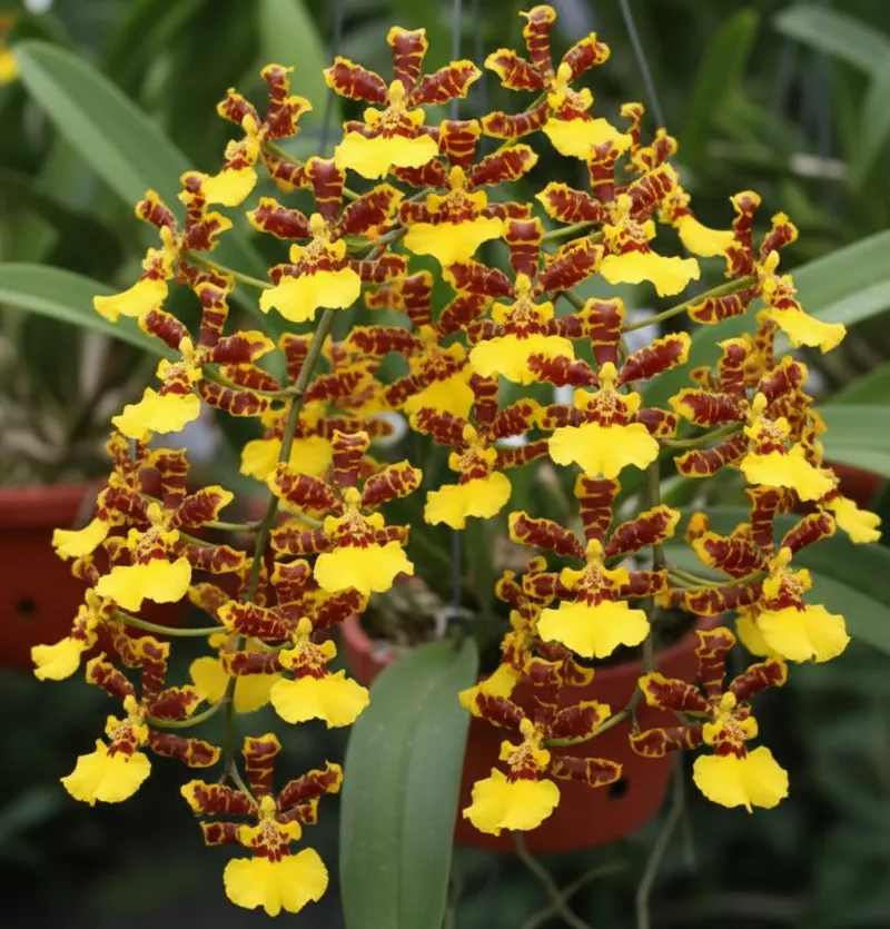 Golden Anniversary is a striking hybrid orchid admired for its brilliant golden-yellow flowers accented with bold red and maroon markings. The dramatic contrast and star-like structure give each bloom a lively, celebratory appearance, making this orchid a true standout when in flower.