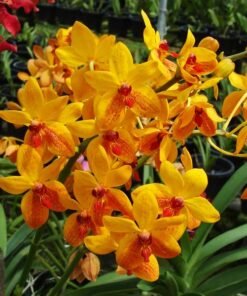 Kagawara is a hybrid of Vanda x Ascocentrum x Renanthera species. Kagawara Sandy Gold is an easy to grow, brilliantly colored Kagawara hybrid. They are potted in plastic basket pots. This gorgeous vandaceous hybrid will flower at any time of year