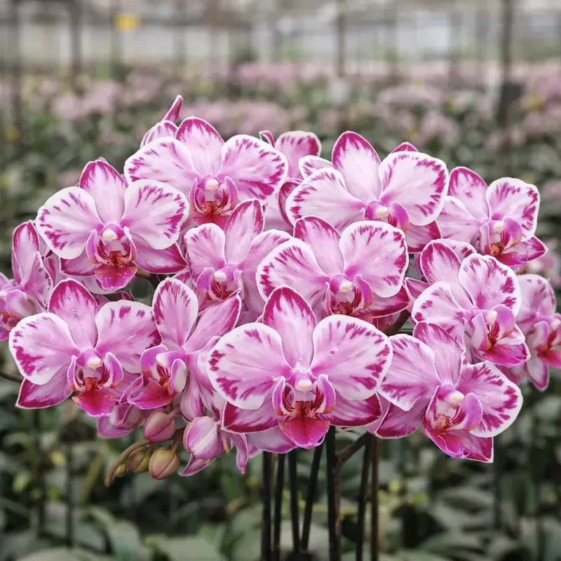 The Matured Phalaenopsis Kaleido With Buds is a vibrant and eye-catching moth orchid known for its striking pink-and-white patterned blooms. Each flower features soft white petals edged and splashed with vivid pink markings, creating a lively kaleidoscope effect. The clustered blooms form a full, rounded display that makes an immediate visual impact.