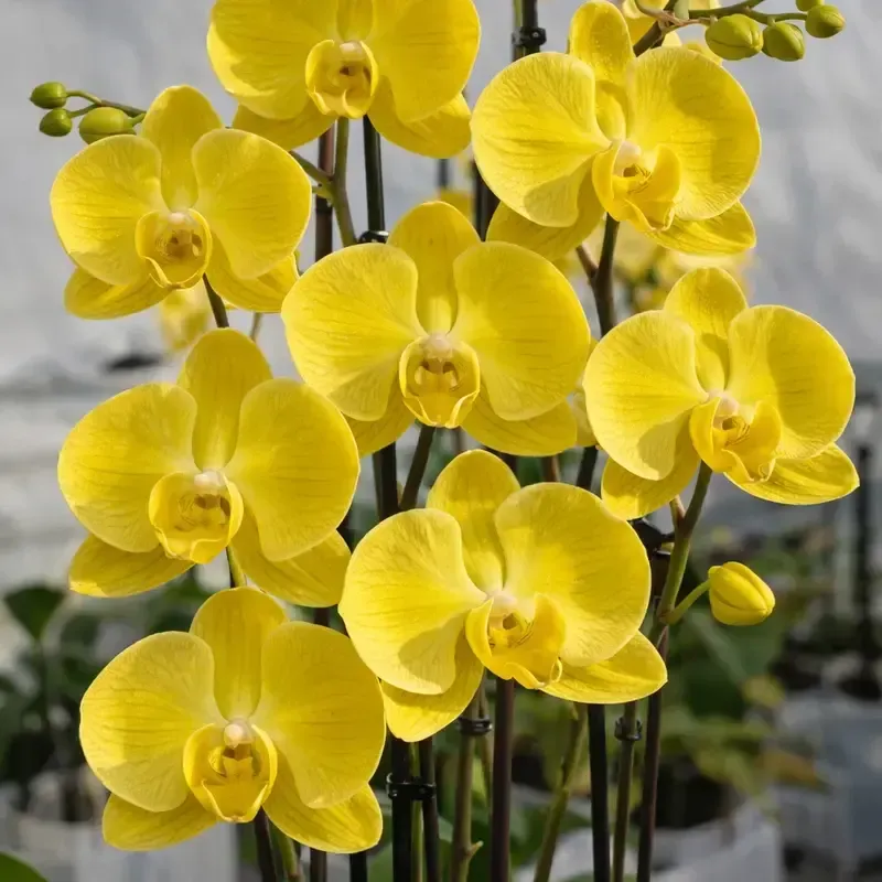 The Matured Phalaenopsis Yellow Canary With Buds is a radiant moth orchid celebrated for its vivid, sunshine-yellow blooms. The smooth, rounded petals glow with rich color, complemented by a soft white and golden center that enhances its bright, cheerful appearance.