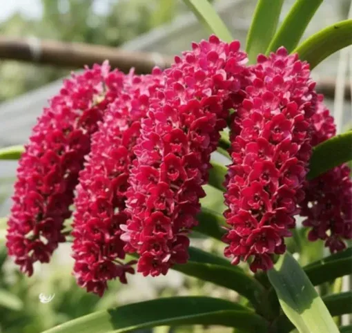 The Matured Rhynchostylis Red Foxtail With Buds/Flowers is a breathtaking orchid prized for its intensely colored, deep red flower spikes that cascade in thick, foxtail-like clusters. Each spike is densely packed with dozens of small blooms, creating a dramatic waterfall effect that commands attention. Offered as a matured plant with buds or flowers, this orchid delivers an immediate and luxurious display.