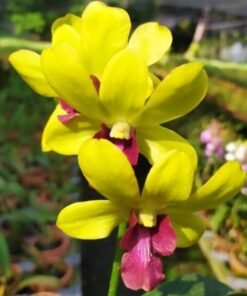 This is a special dendrobium hybrid with fragrant flowers which have bright yellow petals with pink lips.