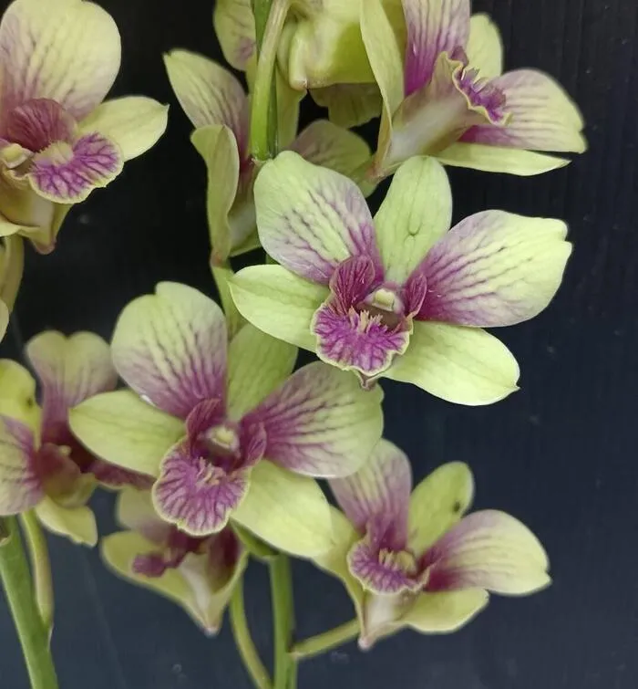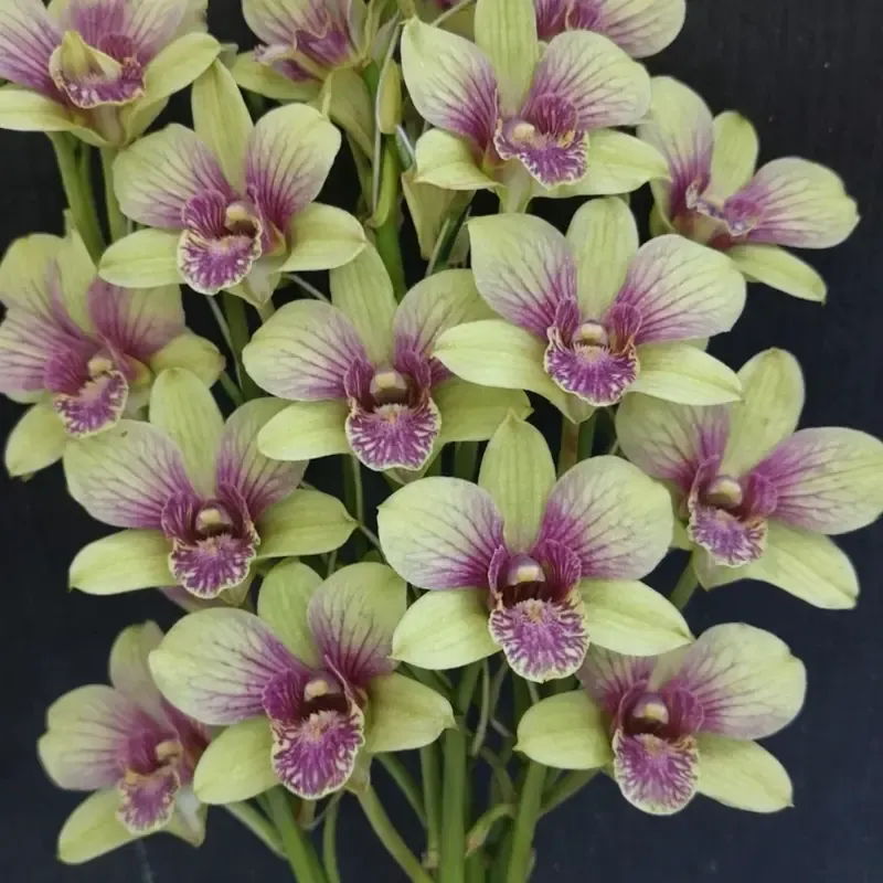 Each spike produces multiple blossoms arranged in a graceful cluster, showcasing the unique combination of pale green tones and striking purple center markings. The subtle veining across the petals adds depth and character to the bloom.