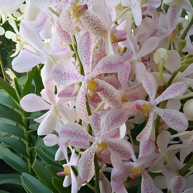 The Mokara White Spot Orchid is a graceful hybrid admired for its soft white blooms enhanced with delicate pink spotting. The flowers are star-shaped and display a refined combination of colors that create a light and elegant tropical appearance.