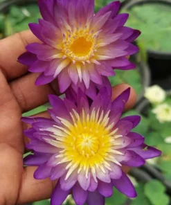 The Nimitmai Water Lily (Nymphaea Nimitmai) is admired for its captivating two-tone appearance. Its petals transition from rich violet to soft purple hues, radiating outward from a bold golden-yellow core. This striking contrast makes the Nimitmai variety a true highlight in any aquatic setting.