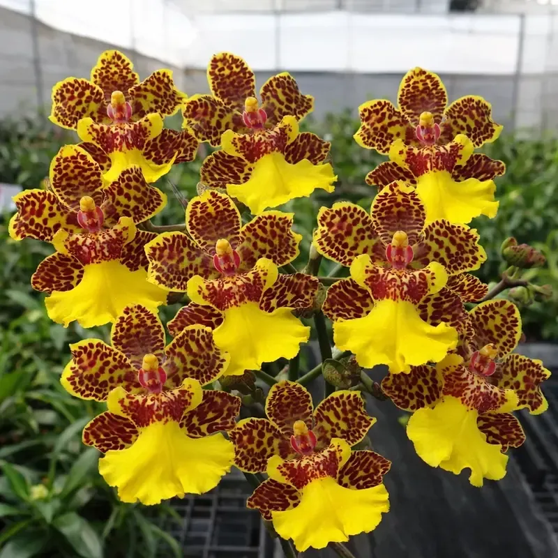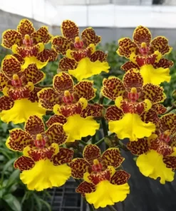 The Trichocentrum Sunny Village – Blooming Size is a beautiful orchid hybrid admired for its bold spotted flowers and vibrant color contrast. The blooms feature golden yellow petals heavily marked with deep red spotting, creating a dramatic and exotic pattern.
