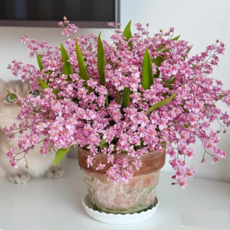 The cascading flower spikes create a graceful display, making this orchid an excellent choice for indoor decoration, gifts, and orchid collections. Its compact growth combined with prolific blooming makes it one of the most popular Oncidium hybrids worldwide.