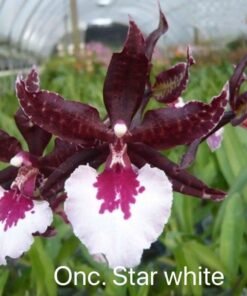 This hybrid has a deep red petals with white skirt. Flowers are 7.5cm in diameter and can have upto 30 flowers in one spike