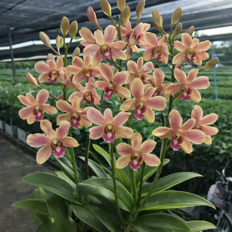 When in bloom, the plant produces numerous flowers arranged along upright spikes, forming dense clusters that create an impressive ornamental display. The soft pastel coloration gives this orchid a refined and natural appearance that stands out among traditional dendrobium varieties.