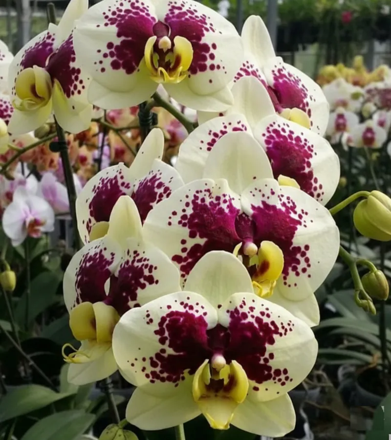 Phalaenopsis Autumn Fest is a richly colored moth orchid admired for its warm, festive tones and bold patterning. The creamy yellow petals are heavily marked with deep maroon spotting and splashes, creating a striking autumn-inspired contrast. This blooming size plant produces large, rounded, long-lasting flowers on elegant arching spikes, making it an excellent choice for collectors, statement décor, and premium gifting.