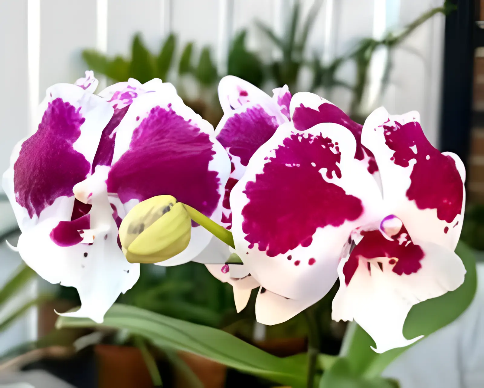 - White petals with bold dark red/burgundy splashes
