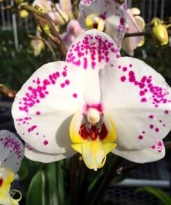 This phalaenopsis is has pink freckles spreaded over its white petals. They are frequent bloomers and an easy to care hybrid that can be grown indoor as well as outdoor.
