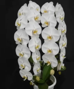Phalaenopsis ‘Misty Snow’ is a classic white moth orchid with satin petals and a soft yellow throat—minimal, elegant, and wonderfully easy for any home or workspace.