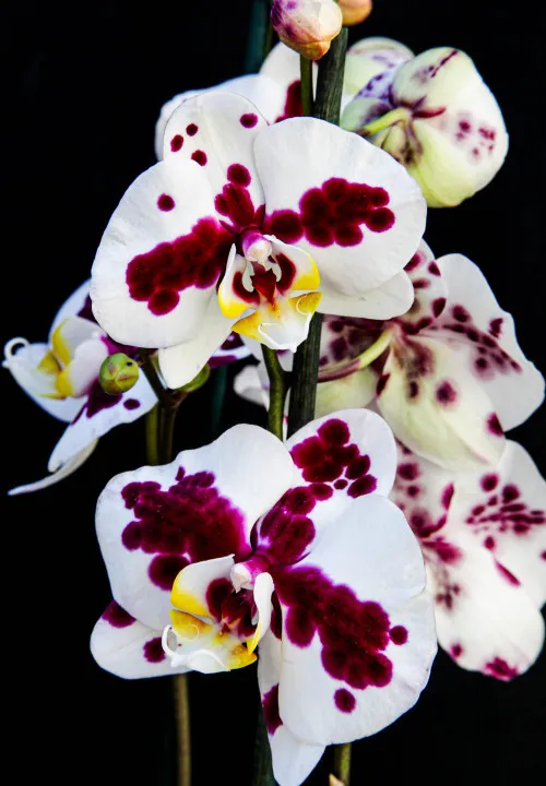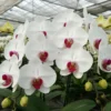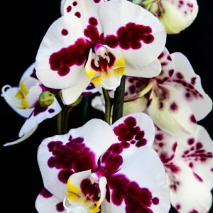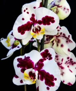 This hybrid phalaenopsis has beautiful red dark spots spread unevenly on white petals. An easy to flower hybrid Phalaenopsis that requires less care. This one can produce multiple spikes of flowers and can have a large number of flowers in one single spike.