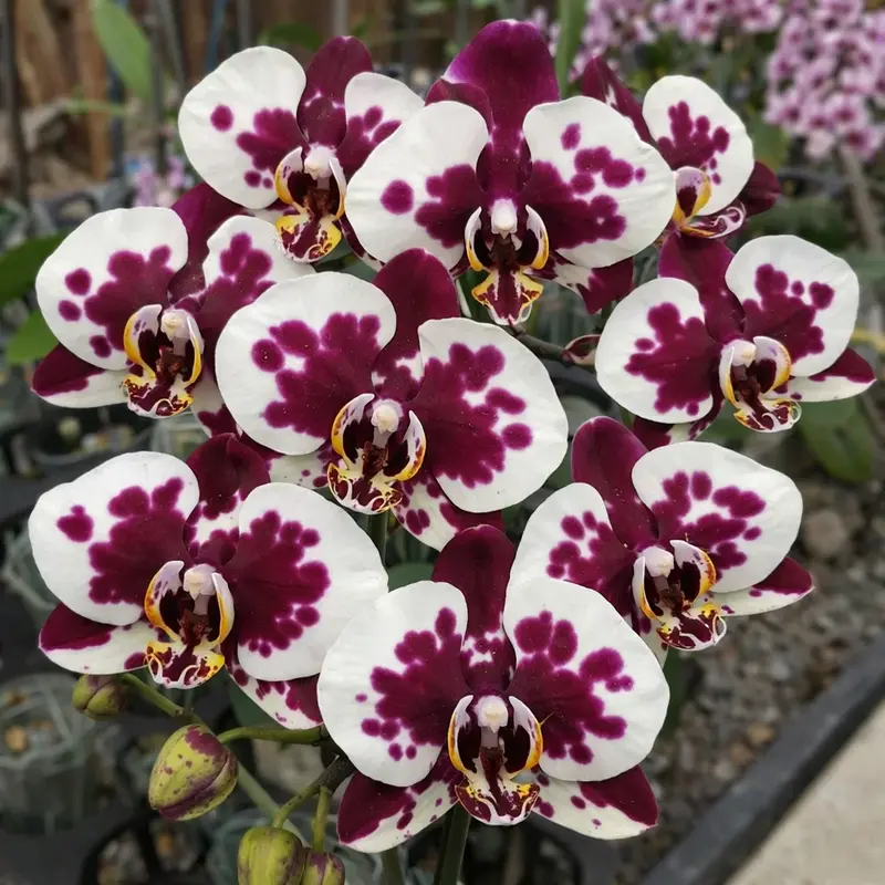 The Phalaenopsis PP428 With Buds – Blooming Size is a dramatic and elegant moth orchid prized for its crisp white petals adorned with deep burgundy spotting and a vibrant yellow-accented lip. The bold contrast and artistic patterning give this orchid a refined, high-impact appearance. Grown to blooming size and shipped with visible buds, this plant is ready to flower shortly after arrival.