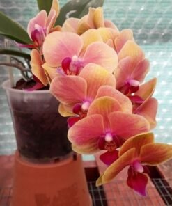 This is a bright orange yellow colored phalaenopsis that can flower frequently. An easy to care hybrid that can be grown indoor as well as outdoor.