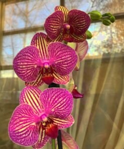 This is a beautiful dark pink striped phalaenopsis with red lips. An easy to care hybrid that can be grown indoor as well as outdoor. A frequent bloomer with large number of flowers.