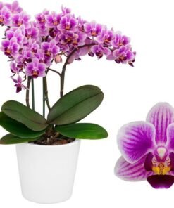 This is ready to flower size matured phalaenopsis orchid plant. This plant will be delivered in a pot planted in coconut chips. Repotting is not necessary. You can grow them indoor under a window light.