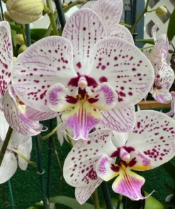 This hybrid phalaenopsis has beautiful red dark spots spread unevenly on white petals that can flower easily. An easy to care hybrid that can be grown indoor as well as outdoor.