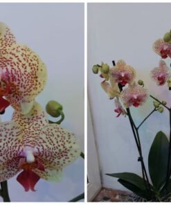 This is ready to flower size matured phalaenopsis orchid plant. This plant will be delivered in a pot planted in coconut chips. Repotting is not necessary. You can grow them indoor also under a window light.