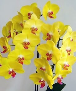 This hybrid phalaenopsis has a yellow colored petals with red lip. An easy to flower hybrid Phalaenopsis that requires less care. This one can produce multiple spikes of flowers and can have a large number of flowers in one single spike.