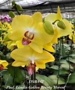 This yellow petalled phalaenopsis has bright red lips and large flowers. An easy to care hybrid that can be grown indoor as well as outdoor. A frequent bloomer with long spikes.