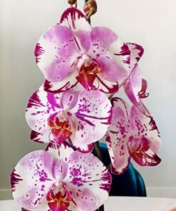 Phalaenopsis Magic Art is a true show-stopper: broad, satiny white blooms brushed with fuchsia splashes, freckles and bold picotee edges. Each flower looks hand-painted, and the long, arching spike presents multiple blooms at once for a dramatic display on a desk, shelf or windowsill.