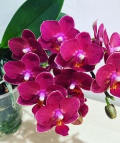 This phalaenopsis has a dark grape wine red color with an attractive central lip. An easy to care hybrid that can be grown indoor as well as outdoor. A frequent bloomer with large number of flowers.