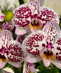 This hybrid phalaenopsis is known for its beautiful dark pink spots and patterns. Flowers are large in size and often blooms in long spikes with a large number of flowers. Easy to take care orchid plant.