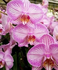 This moth orchid has beautiful pink stripe on its lavender colored petals. They often blooms in long spikes with a large number of flowers. Easy to take care orchid plant.